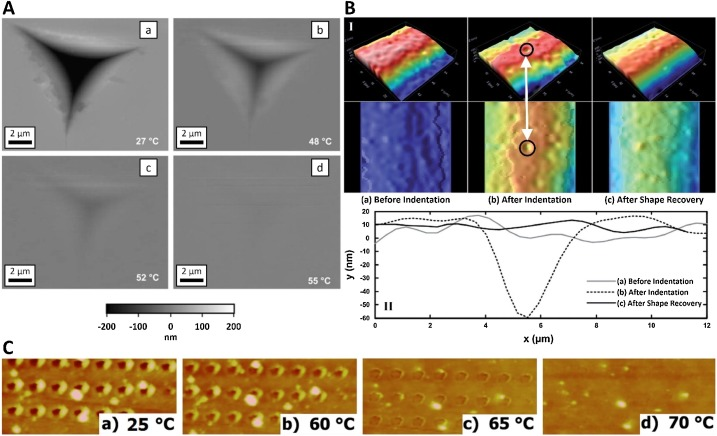 图7.形状记忆效应压痕的自我修(A)聚丙烯酸叔丁酯薄膜中压痕的原子力显微镜攻丝模式图像;(B)聚氨酯形状记忆膜中压痕恢复的三维(I)和二维(II)表面扫描图;(C) AFM图像,从室温到Tg的加热过程中,通过环氧树脂中纳米级压痕的恢复(显示的压痕形状恢复对应于2μN的加载力)。