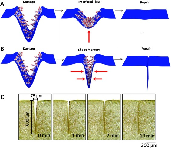 图8.由(A)界面流动和(B)形状记忆驱动的物理修复机制的图形描述;(C)形状记忆驱动的聚氨酯膜伤口闭合的光学显微镜图像。