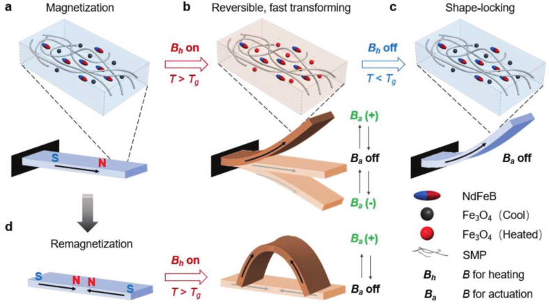 图9.磁性形状记忆聚合物(M-SMP)的工作机。a)M-SMP在低温下坚硬,不能被施加的致动磁场(Ba)致动;b)通过施加加热磁场(Bh),M-SMP变软并可以被激活c)关闭Bh时,M-SMP冷却并变硬,致动的形状被锁定;d)M-SMP的磁化曲线可以重新编程以适用不同的驱动方式。