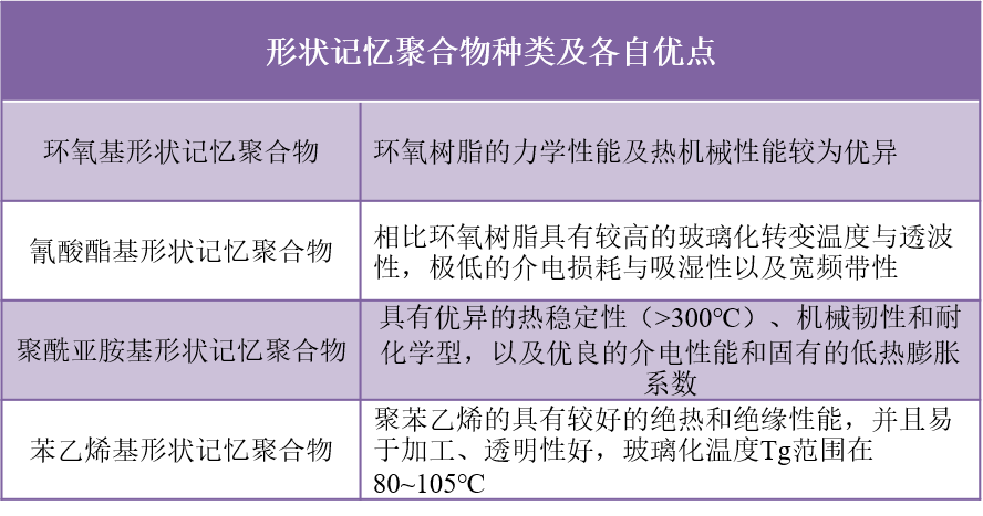 形状记忆聚合物有多种不同的种类,包括环氧基形状记忆聚合物、氰酸酯基形状记忆聚合物、聚酰亚胺基形状记忆聚合物、苯乙烯基形状记忆聚合物。