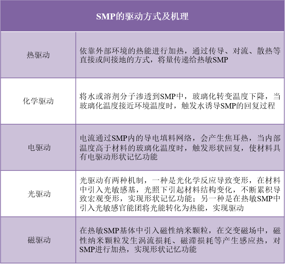 形状记忆聚合物有多种驱动方式,包括热驱动、化学驱动、电驱动、光驱动、磁驱动等。