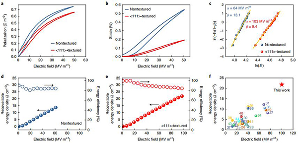 图四、<111>织构和非织构NBT-SBT多层陶瓷的电场诱导应变,击穿强度和储能性能的综合比较