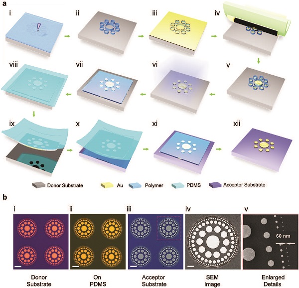 (b)类光子筛金微纳结构阵列在施主衬底(i)、PDMS弹性体(ii)和受体基片(iii)上的光学显微照片。电子显微照片呈现了单个光子筛(iv)的概况和最外层的金纳米点(v)的放大细节。