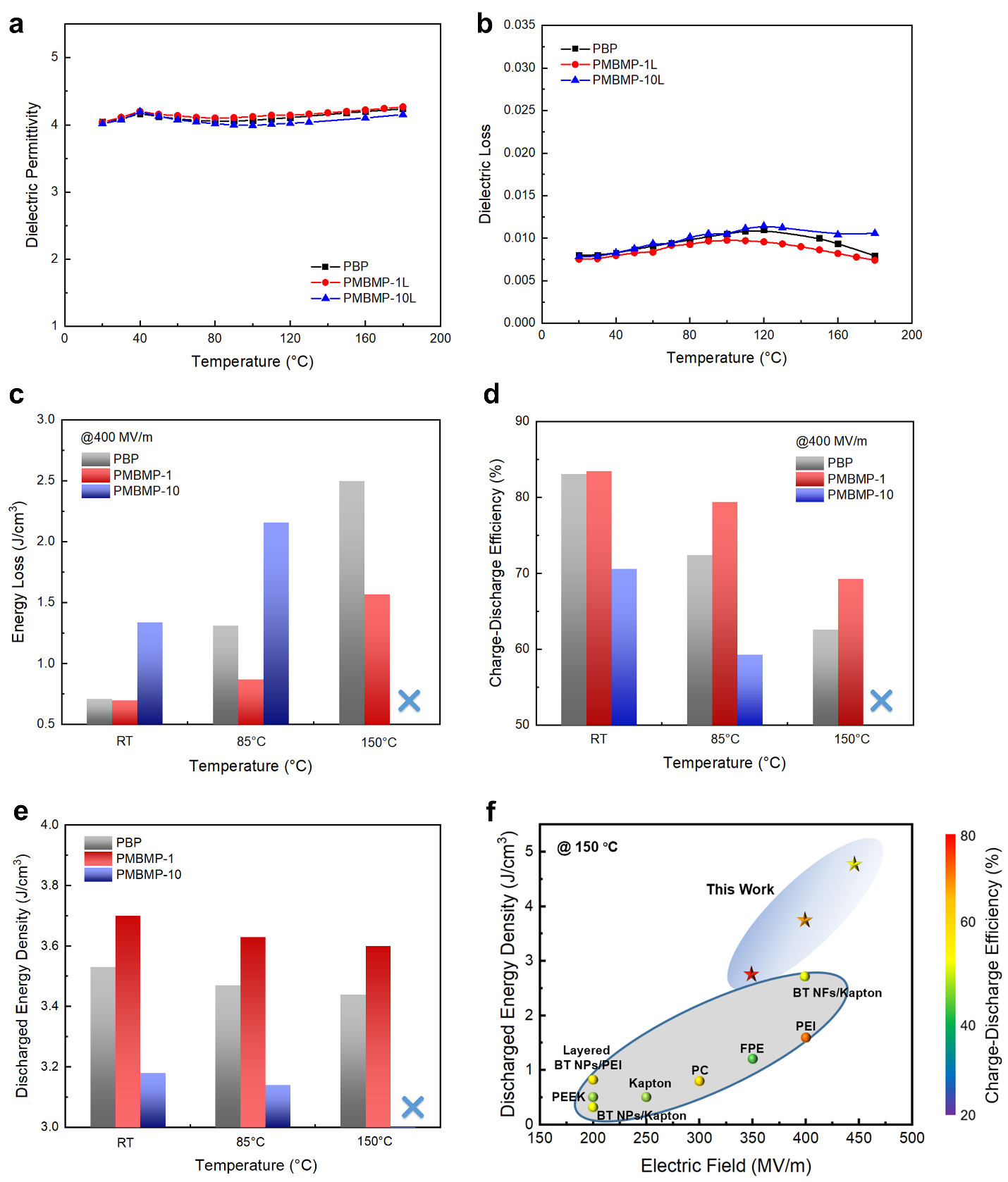 Fig. 3. 高温介电特性. (a) 介电常数、 (b) 介电损耗、(c) 能量损耗、(d)充放电效率以及 (e) 放电能量密度. (f) MMT界面增强复合材料与现有高温介电聚合物及复合材料的性能对比.