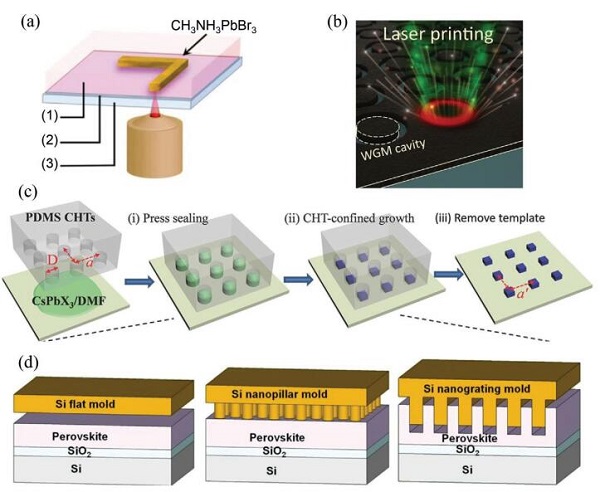 (c)利用溶剂辅助的纳米压印对钙钛矿进行构图的示意图;