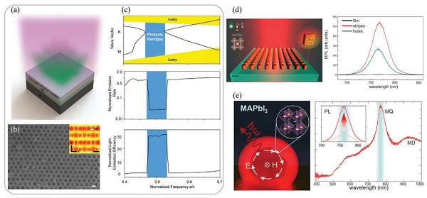 (d)钙钛矿超表面的示意图,以及纳米结构钙钛矿的光致发光增强;