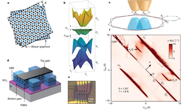 今日,在哈佛大学Philip Kim教授和Liu xiaomeng(共同通讯作者)团队等人带领下,与日本国立材料研究所合作,利用扭曲的两片双层石墨烯(TDBG)的范德华异构,证明了在扭曲角度范围内可通过垂直电场调整的平面电子带。与魔角扭曲双层石墨烯类似,TDBG在半填充和四分之一填充的平带处显示出能量间隙,表明相关绝缘体状态的出现。团队发现,这些绝缘体态的间隙随着平面内磁场的增加而增加,表明存在铁磁有序。在掺杂半填充绝缘体时,随着温度的降低,电阻率突然下降。这种临界行为被限制在密度-电场平面的小范围内,并被归结为从普通金属到自旋极化相关态的相变。在电场可调TDBG中发现自旋极化相关态,为工程交互驱动的量子相提供了一条新的途径。相关成果以题为“Tunable spin-polarized correlated states in twisted double bilayer graphene”发表在了Nature。