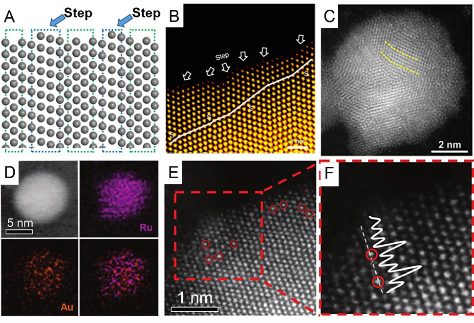 (D-F) 负载Au单原子的Ru纳米颗粒元素分布图像及其AC-HAADF-STEM图像(E和F)。