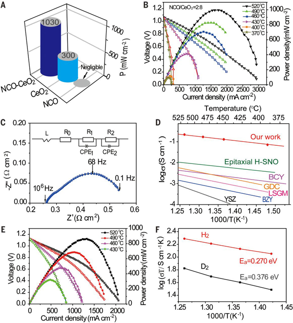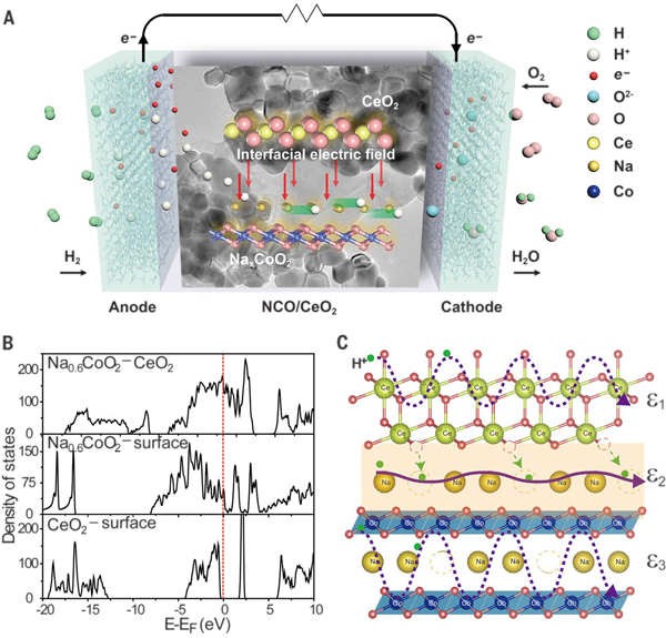 今日,在中国地质大学(武汉)朱斌教授和宋怀兵教授(共同通讯作者)团队等人带领下,与湖北大学、华中HTH官网地址 大学、厦门大学、中国科学院高能物理研究所和英国拉夫堡大学合作,提出一种通过NaxCoO2/CeO2半导体异质结构设计增强质子导体的方法,其中界面处的场致金属态会加速质子传输。 团队开发了一种质子陶瓷燃料电池,在520℃时的离子电导率为0.30 S cm-1,输出功率为1 W/cm2。通过半导体异质结构方法,团队的研究结果提供了对质子传输机制的深入了解,这也可能改善其他能源应用中的离子传输。相关成果以题为“Proton transport enabled by a field-induced metallic state in a semiconductor heterostructure”发表在了Science。