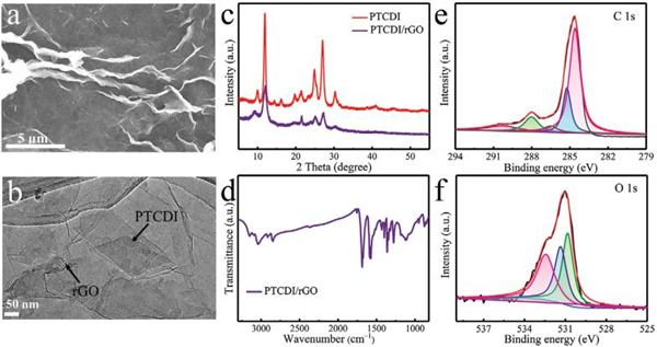 (a,b)PTCDI/rGO的SEM和TEM图像;