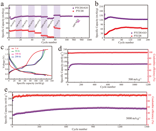(b)在100 mA g-1时,PTCDI和PTCDI/rGO电极的循环性能;