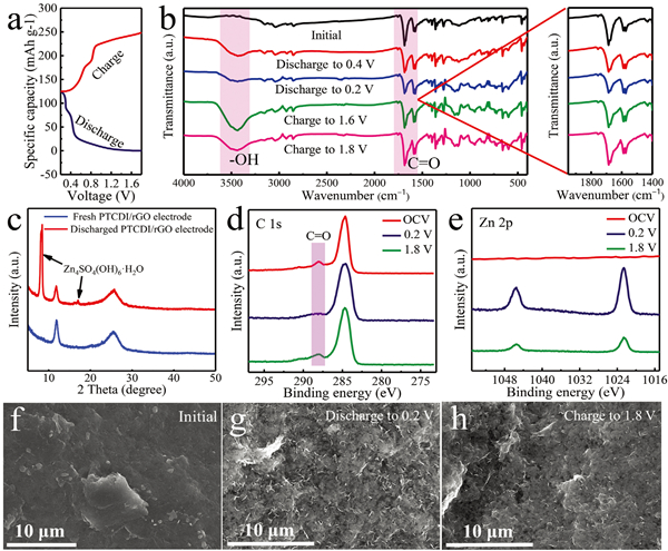 本文开发了一种新型的无枝晶有机负极(PTCDI/rGO)用于水系锌离子电池。该有机电极不仅解决了锌枝晶的生长问题,而且也避免了溶解问题的发生,提高ZIB的稳定性。由于较弱的分子间作用力以及质子和锌离子共参与的转化机制,有机电极表现出优异的电化学性能(在.3000 mA g-1下,展示出130 mA h g-1的优异倍率能力;在1500个循环后,容量保持率为97%)。此外,密度泛函理论也解释了PTCDI放电电压低的原因。这项工作为有机电极的应用提供新的思路,并为解决锌枝晶问题提出新的可能。
