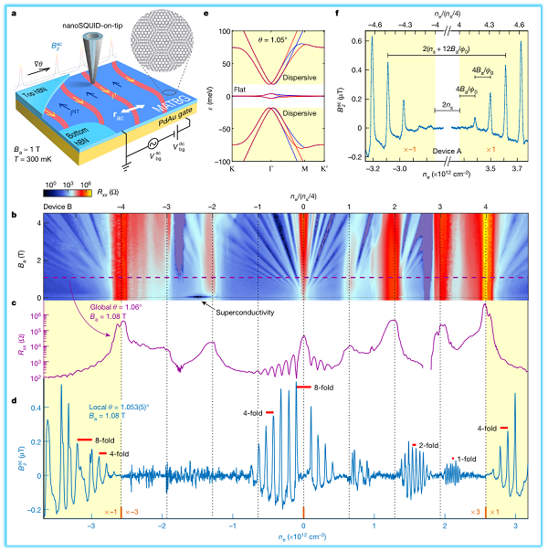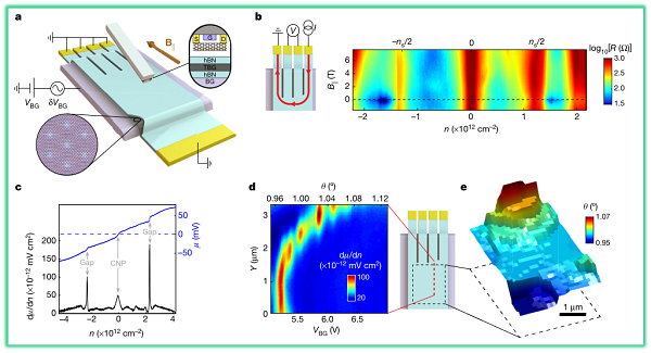 美国麻省理工学院Pablo Jarillo-Herrero教授和“天才少年”曹原使用纳米级针尖扫描超导量子干涉装置(SQUID-on-tip)获得处于子霍尔态的朗道能级的断层图像,并绘制六方氮化硼(hBN) 封装的MATBG器件的局部变化图,其相对精度达到0.002度,并且空间分辨率为几个莫尔周期。研究发现θ无序程度与MATBG传输特性的质量之间存在相关性,并且表明即使是具有相关状态和超导性的最先进的设备,其θ的局部变化也高达0.1度,具有较大的梯度和跳跃网络,并且可能包含没有局部MATBG行为的区域。同时MATBG中的相关状态相对于扭曲角异常特别脆弱,θ的梯度会产生大的栅极可调谐的平面内电场,即使在金属区域也不会被屏蔽,从而通过形成边缘通道而改变量子霍尔态,可能会影响相关态和超导态的相图。因此,作者确立了扭曲角无序作为一种非传统类型无序的重要性,从而能确保在结构设计中使用扭曲角梯度,用于相关现象的实现和门-可调的内置平面电场以应用于设备应用程序。