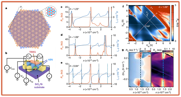 美国麻省理工大学的Pablo Jarillo-Herrero教授和“天才少年”曹原(共同通讯作者)等人报道了一种基于小角扭曲双层石墨烯(TBBG)的高度可调关联系统。TBBG具有丰富的相图,具有可调的相关绝缘体状态,对扭曲角和电位移场的应用高度敏感,后者反映了贝尔纳尔堆叠双层石墨烯的固有极化率。而关联态对磁场的响应则表明自旋极化基态的存在,这与魔角扭曲双层石墨烯完全不同。此外,在较低的扭曲角范围内,TBBG显示了接近电荷中性的多组平坦带,导致许多相关状态对应于每个这些平坦带的半填充,所有这些状态也可以通过位移场进行调整。研究认为,这些结果为在扭曲超晶格中探索扭曲角/电场可控的关联相提供了机会。