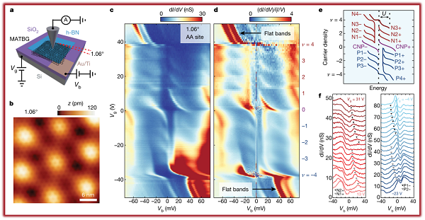 美国普林斯顿大学Ali Yazdani教授等人通过高分辨率扫描隧道显微镜,发现随着电子填充,魔角扭曲双层石墨烯会出现一系列光谱跃迁。每一次整数填充莫尔带,其化学势都会明显变化,低能激发发生重排。这种光谱特征是由于库伦相互作用所造成的,即简并的平坦带分裂为哈伯德子带。经研究发现,这些相互作用(从实验上截取的强度)对垂直磁场的存在非常敏感,极大地改变了光谱跃迁。该工作所报道的级联跃迁,描述了魔角扭曲双层石墨烯是如何从相关的高温母态演变出低温下各种奇妙的绝缘体和超导体基态相。
