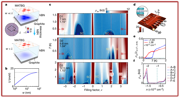 西班牙巴塞罗那科学技术学院Dmitri K. Efetov教授等人报道了通过改变石墨烯和金属屏蔽层的间隔距离来直接调节电子的相互作用。在实验中,他们能够同时控制电子的速度和相互作用能量,从而将绝缘相变成超导相。研究人员使用了扭转角大致偏离魔角1.1°的±0.05°的器件,并将这些器件非常靠近金属屏蔽层,通过绝缘的六边形氮化硼层将其仅隔开几纳米。这使得他们能够减少电子之间的排斥力,并加快这些电子的速度,因此允许它们自由移动,逃离绝缘状态。通过改变不同器件配置中的电压(载流子密度),超导相保持,而相关的绝缘体相消失。该研究为理解双层魔角石墨烯中的绝缘态和超导态之间的关系提供了经验,并为理解具备强相互作用的超导体系的微观机制提供了方案。