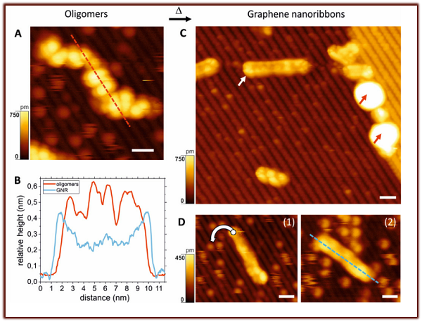 橡树岭国家实验室A.-P. Li,埃朗根-纽伦堡大学K. Amsharov等人提出了一种表面合成方法,可以直接在半导体金属氧化物表面上形成原子精确的GNR。研究人员通过含有三个蒽结构的双溴端基分子DBDFTA作为反应物分子在TiO2表面反应,首先构建蒽的长链分子结构,随后将蒽之间进行分子内构建更大的芳环。随后借助大芳环上的应力构成大芳环体系。研究人员通过扫描隧道电子显微镜对纳米带中的HOMO、HOMO+1、LUMO、LUMO+1结构进行分析。扫描隧道显微镜和光谱证实了由明确定义的之字形末端终止的平面扶手椅式GNR的形成,这也揭示了GNR与金红石型TiO2底物之间的相互作用较弱。