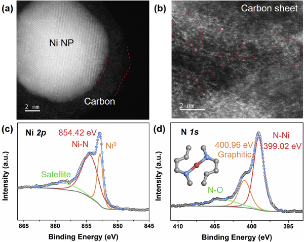 (a,b)Ni-NC@Ni的HAADF-STEM图像,显示了Ni原子在碳骨架中的原子分散。
