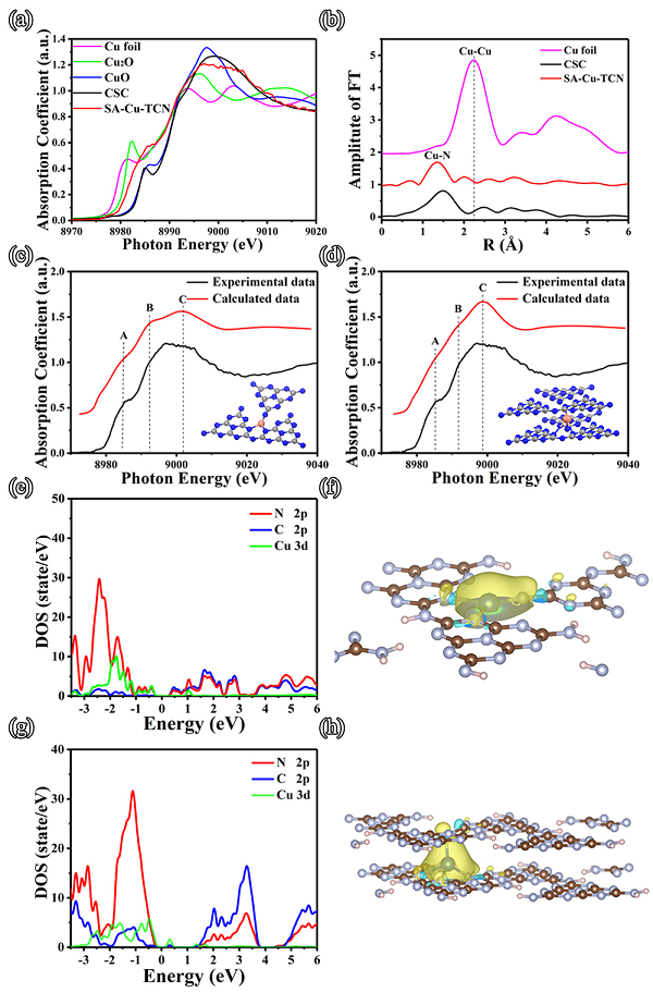 a-d) 单原子铜/C3N4与参比样品的同步辐射吸收谱