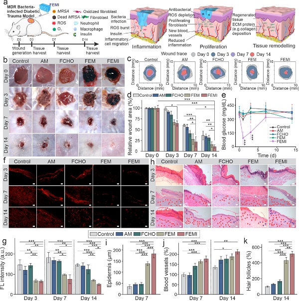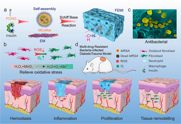 图一、FEMI水凝胶对感染多药耐药细菌的糖尿病创口愈合的示意图