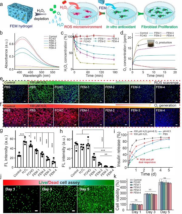 (b)FEMI水凝胶可以通过分解大量的ROS(H2O2)转化为O2来保护成纤维细胞免受氧化应激。