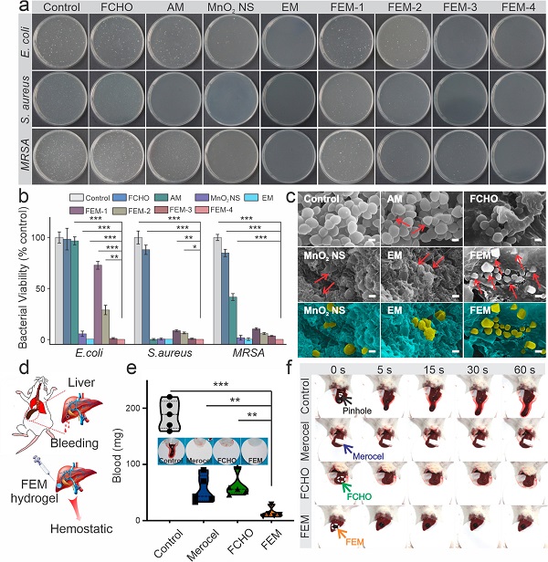 (d)FEM水凝胶在糖尿病小鼠肝出血模型中止血能力示意图。