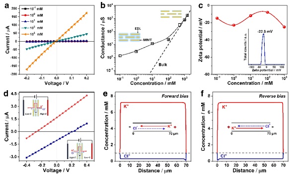 综上,作者首次提出仿生温度门控阳离子通道应用于渗透能可控收集的概念,发展了具有优异的阳离子选择性和温度门控功能的蒙脱土基二维纳米通道,基于其构筑的浓差电池最大输出功率约为0.15 W/m2,距目前报道的最高值仍有一定距离,但是其能量输出可以通过降低膜电阻来提升。在30 oC和60 oC的温度外场调控下,体系输出电流的比值可达到9,且电流切换具有良好的可逆性和稳定性。该工作的研究思路和构筑方法为开发具有智能开关功能的新型浓差电池提供新的见解。