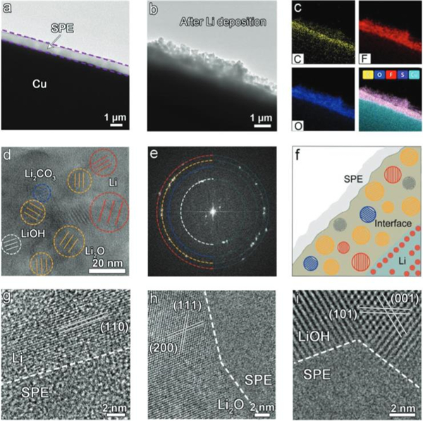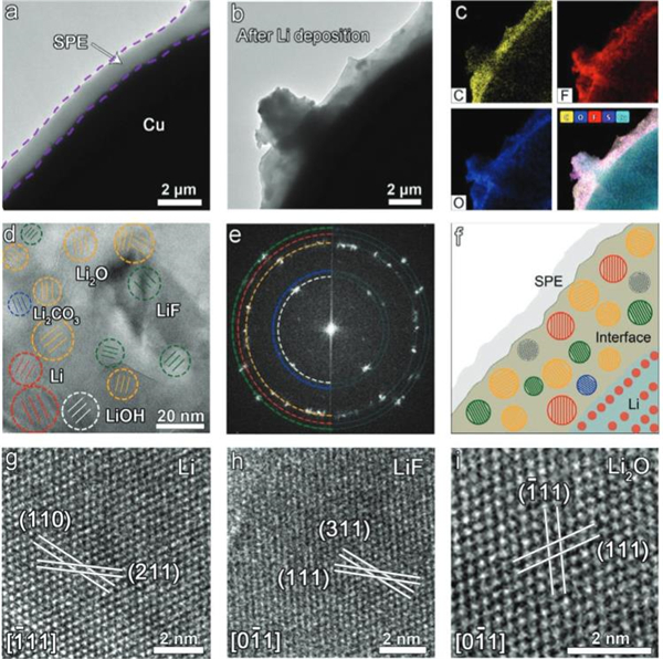 (g-i)Li、Li2O和LiOH晶体与非晶态SPE间的界面HRTEM图。