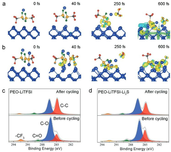(a,b)分子动力学模拟(a) PEO-LiTFSI电解质和(b) PEO-LiTFSI-Li2S电解质中TFSI–的分解;