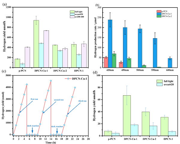 (d) 不加助催化剂情况下的双缺陷体系全光段、可见光段制氢活性