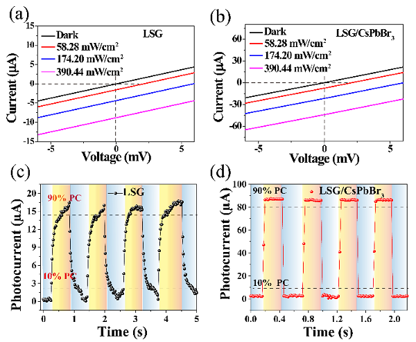 图3 LSG/CsPbBr3复合材料与LSG材料器件光电特性对比