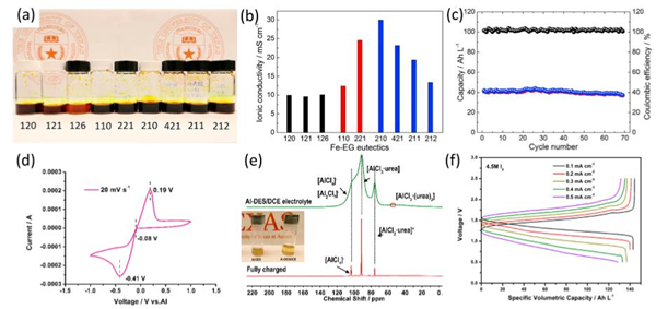 (a,b)各种铁基低共熔电解液的光学照片和离子电导率;