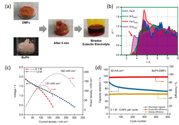(a)基于BuPh和DMFc氧化还原活性分子制备双氧化还原低共熔电解液的策略;