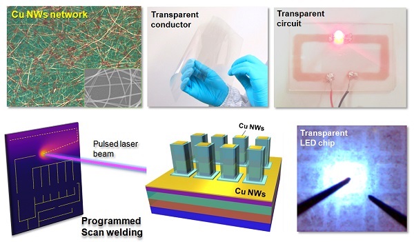 近日,厦门大学蔡端俊教授、陈小红助理教授(共同通讯作者)、康俊勇教授等人提出了通过脉冲紫外(UV)激光束对铜纳米线网络进行可编程的超快扫描焊接方法,并将TCE应用在基于GaN的紫外和蓝光LED芯片,同时实现了透明柔性电路的激光直写制备。高纵横比的铜纳米线通过油胺(OLA)介导的溶液系统(以Ni离子为催化剂)合成的。核心技术结合脉冲UV激光束照射和可程序化的移动台,以实现Cu NWs网络的超快焊接(单脉冲10 ms)。研究结果揭示了Cu纳米线在深UV波长范围(低于约250nm)具有高光吸收效率和局域热效应。通过逐行扫描和选择路线扫描两种不同的模式,可以分别实现大面积的TCE薄膜(20X20 cm2)和透明柔性电路制备。该TCE薄膜具有高性能(33 Ohm/sq,87%透射率)和高稳定性。有限元模拟阐明了瞬态热分布和焊接机理对激光波长、NW直径和距离的依赖性。采用激光扫描焊接法成功制备铜纳米线TCE的完整紫外线和蓝色LED芯片,并实现了明亮的顶面发光。这种处理策略提出了未来电路的新概念,使得超快速方便地直接书写透明柔性电路,制备柔性高效光电子器件成为可能。该成果以题为“Programmed Ultrafast Scan Welding of Cu Nanowire Networks with a Pulsed Ultraviolet Laser Beam for Transparent Conductive Electrodes and Flexible Circuits”发表在ACS Applied Materials& Interfaces上。