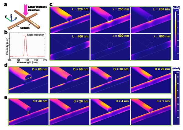(c)计算得出的交叉铜纳米线相对于激光波长的热分布,范围为220至800 nm