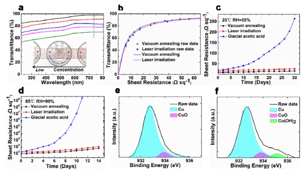 (e,f)在环境中暴露30天并在85 oC和RH = 90%的条件下暴露14天的激光焊接Cu NW的XPS光谱