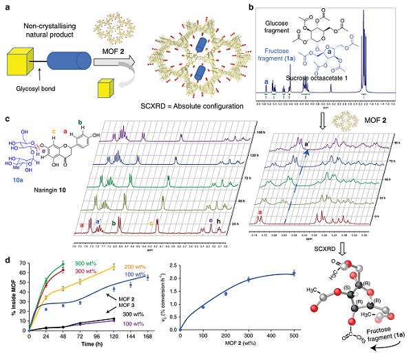 未结晶的天然产物的确切化学结构仍然是自然科学的主要挑战之一。尽管在全合成方面取得了巨大的进展,但对无数具有非常敏感化学功能的天然产物的绝对结构测定仍未完成。在这里,西班牙巴伦西亚大学的Jesús Ferrando-Soria教授、Emilio Pardo教授联合意大利卡拉布里亚大学Donatella Armentano教授等人展示了一个吸附水的含有羟基的金属有机骨架(MOF),可以选择性水解糖基键,通过超分子秩序与所形成的手性片段,并通过单晶x射线晶体学可以确定有机结构。这种基于仿生、廉价、可用的固体催化剂的组合策略,为确定酮类化合物的绝对结构而不考虑降解敏感性,也为设计极温和的无金属固体催化过程而不需要酸性质子打开了大门。相关研究以“Hydrolase–like catalysis and structural resolution of natural products by a metal–organic framework”为题目,发表在Nature Commun.上。