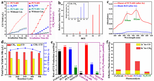 电子空穴对的复合严重降低了光催化剂的效率。这个问题可以在金属有机框架(MOFs)通过优化电荷转移动力学通过合理的结构设计在原子水平。中科院福建物构所Rong Cao等报道了一种集光捕获器,活性催化位点和高表面积为一体的吡唑基卟啉镍-MOF(PCN-601),并通过实验证实了该材料是一种出色且耐用的光催化剂,可用于高效催化室温下可见光驱动的通过H2O蒸气的CO2还原。动力学研究表明,吡唑基团和镍氧团簇的强配位使PCN-601具有合适的能带排列和超快的配体到节点的电子转移。因此,PCN-601催化CO2转化CH4产量远远超过基于羧酸卟啉和经典Pt/CdS光催化剂类似MOFs的3倍和20倍以上。该反应避免了清除孔剂的使用,在气相中进行,可以充分利用MOFs高的气体吸收量。研究表明,合理设计MOF结构配位球不仅可以解决反应性与稳定性之间的矛盾,而且可以极大地促进界面电荷转移,实现动力学优化,为设计高效MOF光催化剂提供指导。相关研究以“Boosting Interfacial Charge-Transfer Kinetics for Efficient Overall CO2 Photoreduction via Rational Design of Coordination Spheres on Metal-Organic Frameworks”为题目,发表在JACS上。