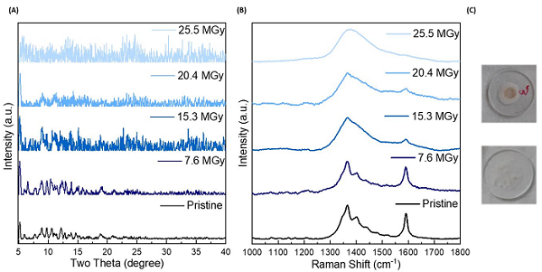 美国圣母大学Peter C. Burns等人合成了一种六聚体的含钍有机骨架(TOF-16),并对其进行了表征和辐射检测。辐射稳定性测试使用的是γ射线和5MeV He2+离子模拟粒子。4 MGy剂量照射TOF-16时,X射线衍射看不到明显的体结构损伤。为了进一步探测辐射稳定性,对MOF进行了He2+离子辐照研究。衍射数据表明在大约15 MGy的照射下结晶度开始下降,在大约25 MGy的He2+离子照射下结晶度完全下降。观察到的高辐射抗性表明,MOFs可以承受核废料流中发现的剂量的辐射照射,这突出表明需要有系统的方法来理解并最终设计具有特殊辐射抗性的框架。相关研究以“Unprecedented Radiation Resistant Thorium-Binaphthol MOF”为题目,发表在JACS上。