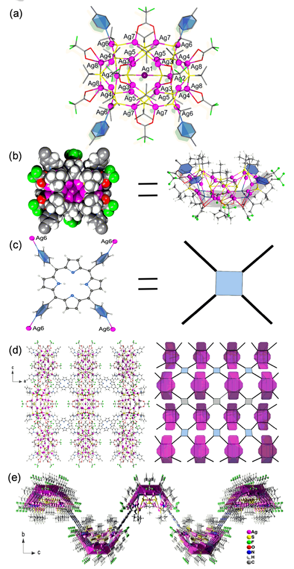 铸造金属(Cu、Ag、Au)基催化剂在有机合成化学中得到了广泛的应用,而稳健的多相银基催化剂由于其高光敏性和化学不稳定性而难以获得。在此,山东大学Di Sun,Ping Cui教授等报道了一个5,10,15,20-四(4-吡啶基)卟啉(TPyP-H2)配体连接有基于双S2-模板的Ag27团簇形成的2D金属有机框架(Ag27-MOF)材料,并将其用作多相催化剂。这种银团簇组装材料是一种高效的异相催化剂,用于在大气压力下末端和内部炔丙基胺环化与催化CO2。密度泛函理论(DFT)计算表明,Ag27-MOF具有较高的催化活性和较宽的底物范围,这是由于其具有鞍状金属节点,其特点是具有高密度银原子的易接近平台,具有高密度银原子作为π-路易斯酸位点用于激活C≡C三键。本研究不仅为基于银簇的二维MOF材料的组装提供了一种新的方案,而且为高效银簇多相催化剂的合理设计开辟了一条新途径。相关研究以“Ambient Chemical Fixation of CO2 Using a Robust Ag27 ClusterBased Two-Dimensional Metal-Organic Framework”为题目,发表在Angew.上。