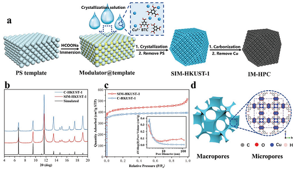 有序宏观微孔单晶金属有机骨架结构(MOFs)在限制扩散过程中具有良好的应用前景。然而,合成这种MOFs的报道仍然很少。华中HTH官网地址 大学徐智谋、周军教授等人提出了一种有序大微孔单晶MOFs的通用合成方法,报道了一种在双溶剂体系中采用单配体诱导的三维有序硬模板原位结晶法制备单晶有序大微孔MOFs的新方法。为了阐明模板的成形效果,提出了一种空间混合生长模型,分析了单配体的作用。此外,由宏观微孔MOF衍生的碳材料继承了有序的互联大孔结构。扩散率的提高、电阻的降低以及结构的鲁棒性,使得该衍生碳材料在制备超级电容器电极时具有优异的速率性能和良好的循环稳定性。预计该方法将为此类宏观微孔材料的合成提供新的途径,并可应用于能源相关材料等领域。相关研究以“Fabrication of Ordered Macro-Microporous Single-Crystalline MOF and Its Derivative Carbon Material for Supercapacitor”为题目,发表在AEnM上。