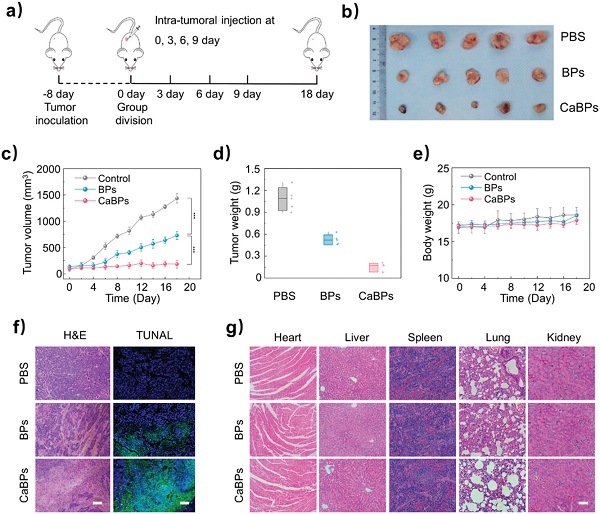 综上所述,原位磷酸钙(CaP)矿化是BPs表面功能化的一种理想的方法,可以显著提高BPs的抗癌活性和荧光成像。CaP沉积不影响BPs的固有性质和形态,同时增加荧光团的负载能力,以便于生物成像和追踪。得到的CaBPs比BPs具有更高的抗癌活性,这是由于CaBPs的pH响应性降解增强和细胞内额外的Ca2+释放。此外,CaBPs还可以靶向线粒体,引起线粒体介导的细胞凋亡。体内实验证实经静脉注射的CaBPs和PFF修饰的CaBPs确实可以靶向原位乳腺癌细胞,以抑制肿瘤生长,而不会产生不良反应或毒性。CaBPs具有良好的靶向抗癌活性,在肿瘤治疗中具有广阔的应用前景,近一步拓展了活性磷疗技术,也为无机活性纳米制剂的开发及修饰提供了新思路。