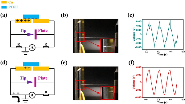图5 通过TENG诱导的微等离子体实验演示用于测量TENG实际输出电压的非接地测量方法。非接地测量方法的等效电路(a),产生的微等离子体照片(b),测量TENG的实际输出电压(c)。接地测量方法的等效电路(a),微等离子体消失的照片(b),测量TENG的输出电压(c)。