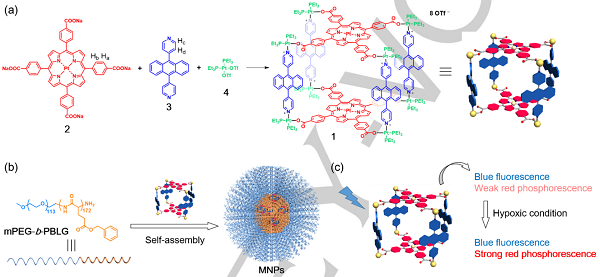 众所周知,细胞内氧气(O2)是有氧呼吸所必需的,为生命系统提供代谢能量。通常,具有快速增殖和新陈代谢的组织(实体瘤等)可以摄入更多的O2,从而导致缺氧。因此,检测和成像活细胞中的乏氧不仅对于准确的癌症诊断很重要,而且对评估治疗效果也非常有用。然而,由于生物还原,检测还原酶探针的发射是不可逆的,限制了其在可逆监测细胞内O2水平中的进一步应用。同时,大多数磷光探针基于单磷光染料,单发射强度易被探针的浓度和其它生物条件改变,而相对缺乏准确性和可靠性。因此,开发具有多重发射和磷光特性的新型低氧探针非常重要。超分子配位化合物(SCCs)是一种依赖于金属受体和路易斯碱性有机配体的自发自组装的化合物,在模拟和研究天然超分子组装方面被广泛关注。目前,精确组装的各种Pt(II)金属杂环和金属载物,被广泛用于细胞成像等领域。因此,在低氧成像中应用Pt(II) SCCs是有希望的。