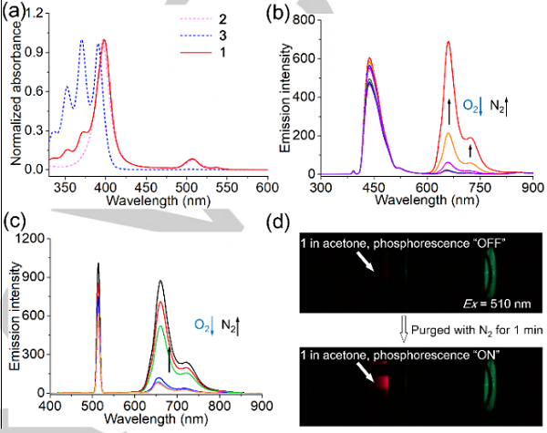 (a)化合物1、2和3的归一化UV-vis光谱图;