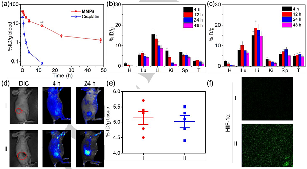 (b-c)注射后,顺Pt和MNPs在体内的组织分布;