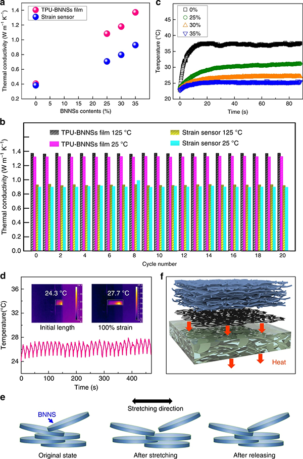 (b)分别在25和125°C之间交替进行多次加热和冷却循环时,不同BNNSs含量应变传感器的热导率。