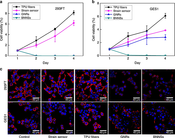 总之,本文报告了一种具有先进热管理功能的高性能应变传感器。应变传感器包含TPU作为矩阵,以及用于导热和导电的BNNS和GNR,并具有量身定制的热性能。 高伸缩性和灵敏度以及长期的电气特性使其成为精确监控人体运动的理想选择。特别是,浇铸的TPU-BNNS薄膜可提高热导率,有助于快速将热量传递到环境中,而多孔电纺纤维膜层则可起到隔热作用,可作为皮肤保护剂。此外, TPUBNNS膜与空气之间界面导热率高达2.9×104 W m-2K-1,且首次研究了在重复拉伸-释放过程下可拉伸电子器件的动态工作温度波动。测试结果表明,可拉伸应变传感器具有出色热稳定性。最后,通过试验证实,活性纳米填料可以被严格限制在纳米复合材料中,并防止其浸出,这对于与皮肤连接的设备至关重要。 改工作可以为下一代可穿戴和可拉伸电子产品的热管理提高了设计思路。