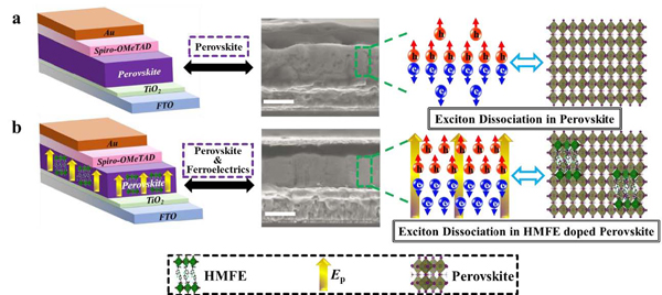 a)对照组和b)HMFE掺杂的钙钛矿器件结构、SEM截面和激子分离示意图。 在HMFE自发极化电场作用下,HMFE掺杂的钙钛矿薄膜显示出更有效的电荷分离。Ep:HMFE的自发极化电场。比例尺:500 nm。