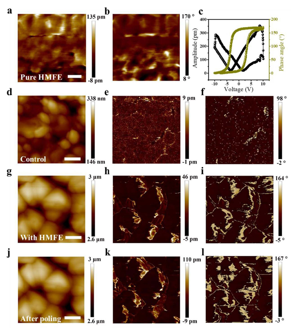 a-c)纯HMFE的a)PFM振幅,b)PFM相位图,c)局部压电迟滞回线。对照组和HMFE掺杂钙钛矿薄膜在极化前后的 d,g,j)AFM,e,h,k)PFM振幅和f,i,l)PFM相图。比例尺:a)为200 nm,d,g,j)为1 μm。